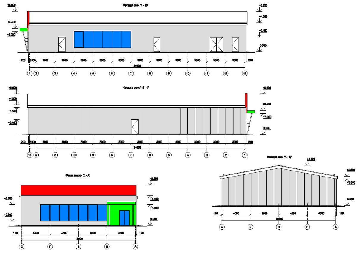 Размер здания магазина Пятёрочка из сэндвич панелей 18х34х3,6м с скатной кровлей и парапетом