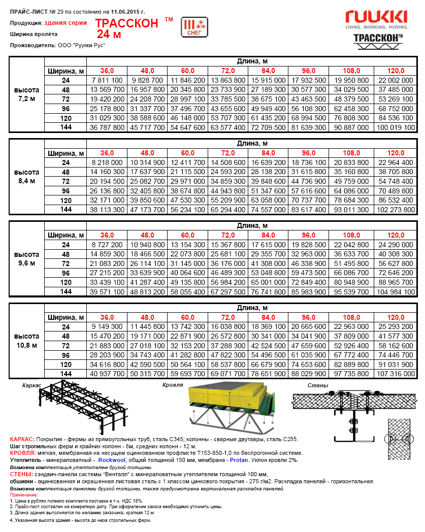 Здесь приведены цены на полнокомплектные здания из ферменных конструкций серии трасскон. Комплектация облицовки для стен сэндвич панелями, облицовка кровли многослойная - несущий профлист +утеплитель +гидроизоляция покрытием мембраной.
